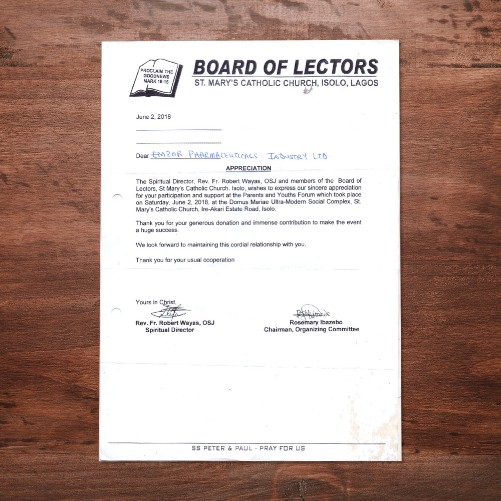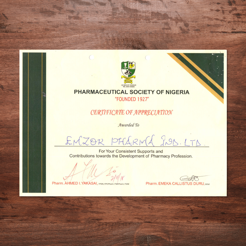 The Pharmaceutical Society of Nigeria was established with the objectives of maintaining a high standard of Professional ethics and discipline among its members, and to promote and maintain a high standard of Pharmaceutical Education in Nigeria. It was our honour to receive a Certificate of Appreciation for Emzor Pharma.