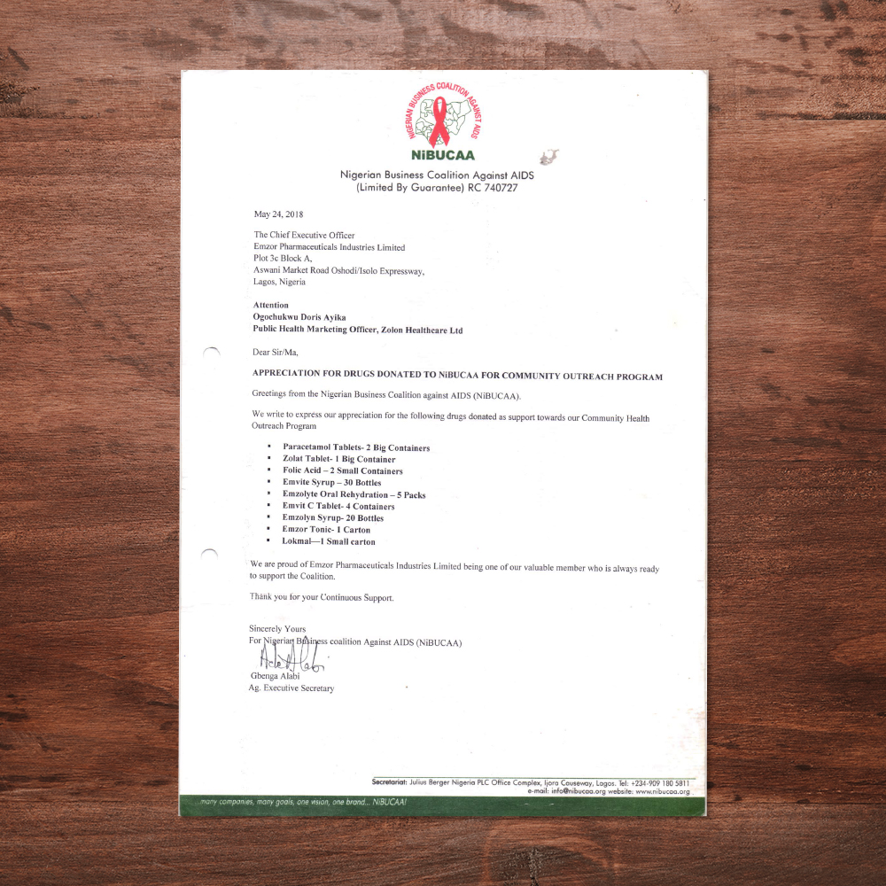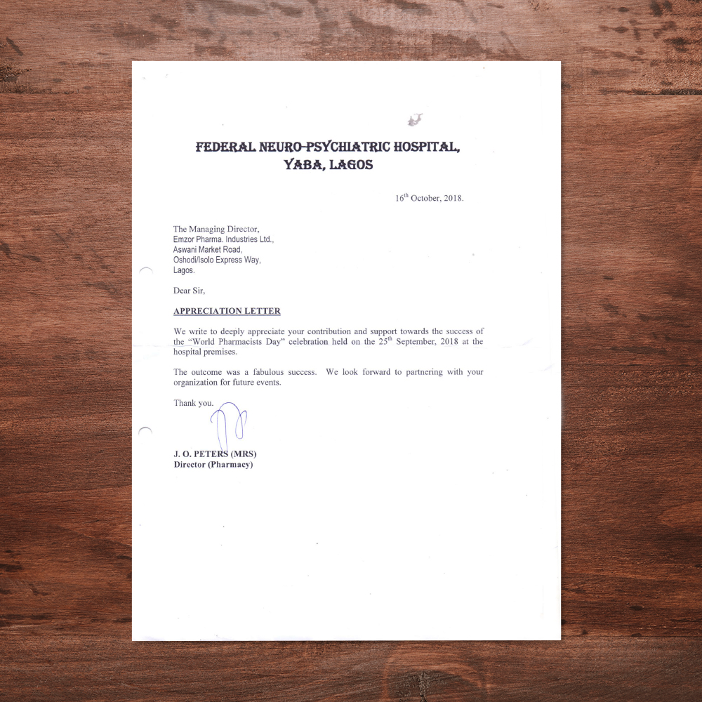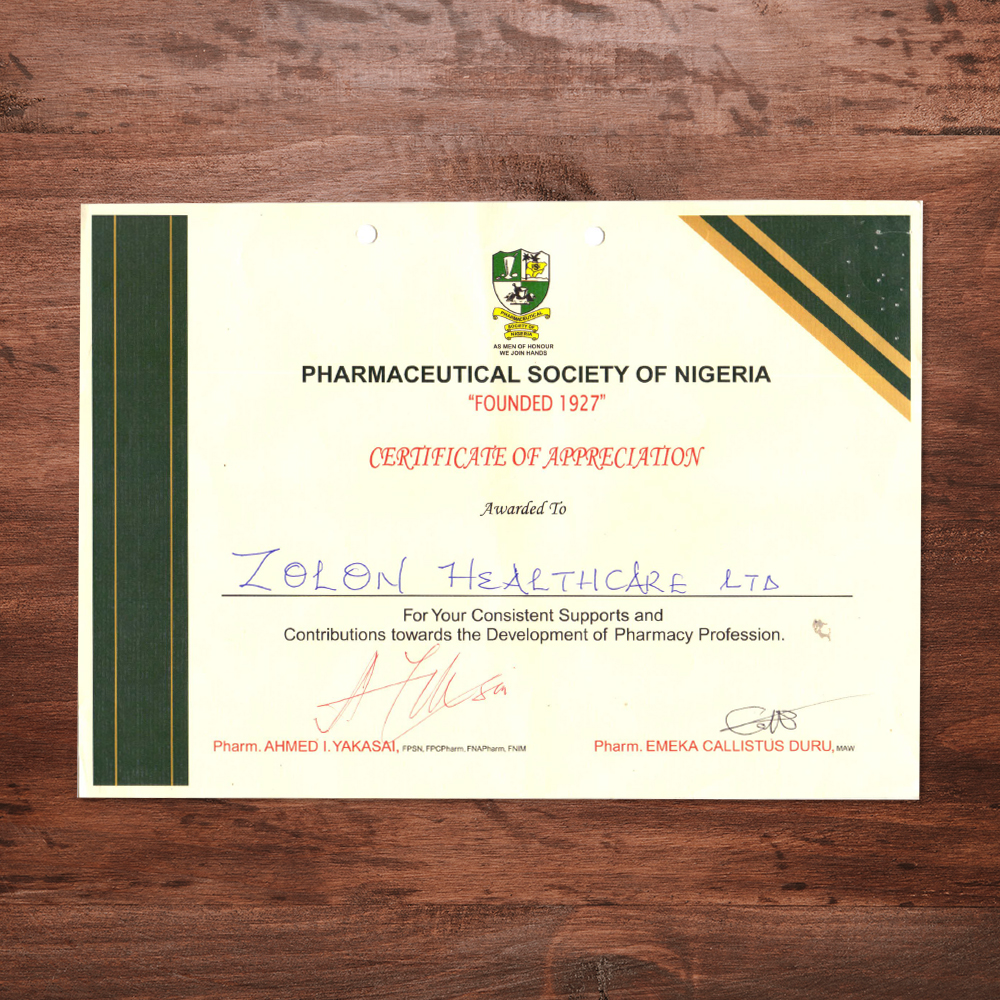 The Pharmaceutical Society of Nigeria was established with the objectives of maintaining a high standard of Professional ethics and discipline among its members, and to promote and maintain a high standard of Pharmaceutical Education in Nigeria. It was our honour to receive a Certificate of Appreciation for our subsidiary, Zolon Healthcare.