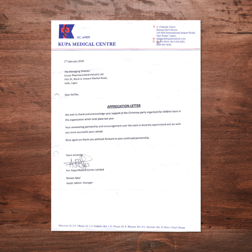 Kupa medical center is a fully equipped medical facility to provide care in all fields of medicine and intensive care unit for babies with state of the art incubators. Below is a letter of appreciation from KUPA Medical Center Limited for our support and contribution to the Christmas Party for Children.